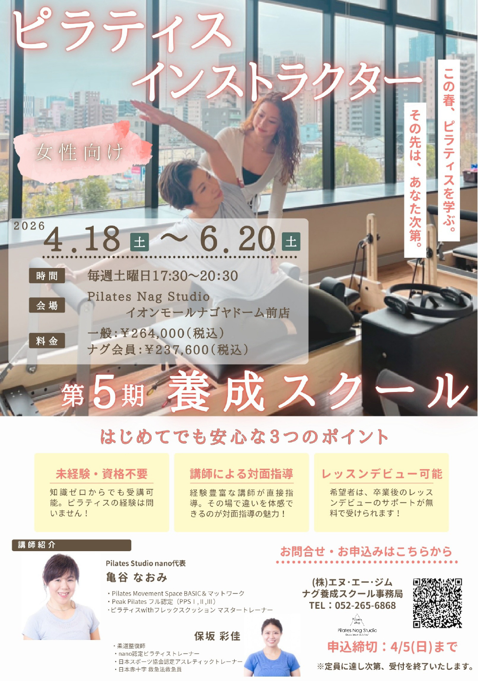 詳しい内容は、ピラティスナグのホームぺージから養成スクールぺージをご確認願います。